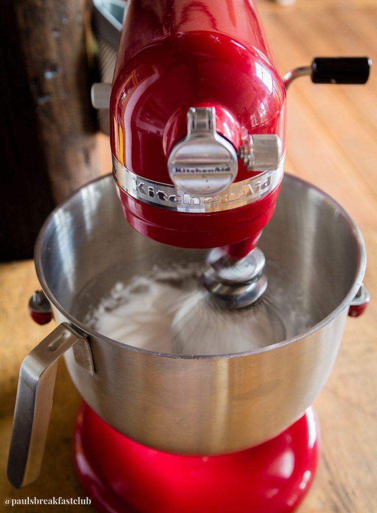 - Eier trennen. Das Eiweiß zusammen mit Vanillezucker in der Küchenmaschine schaumig aufschlagen. Mindestens 3 Minuten laufen lassen, damit die Masse stabil und schneeweiß wird.