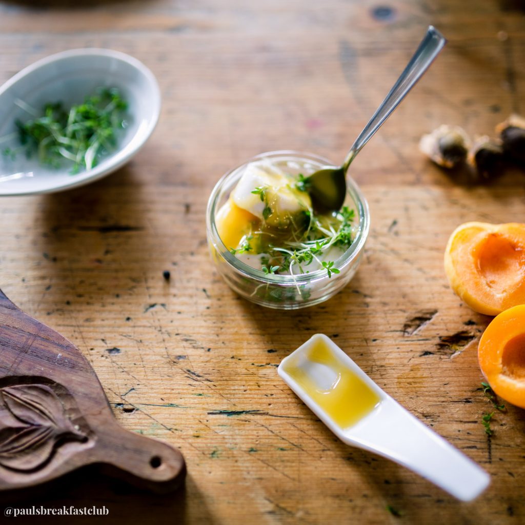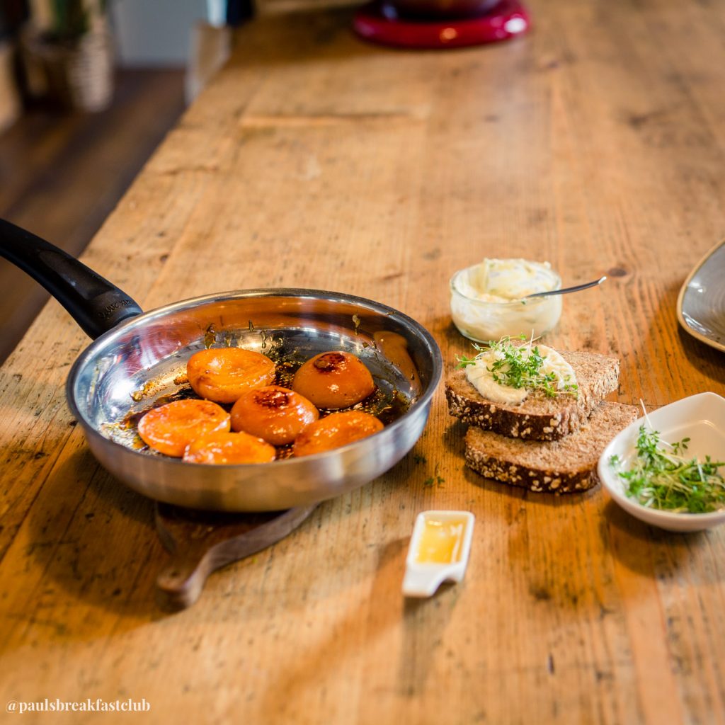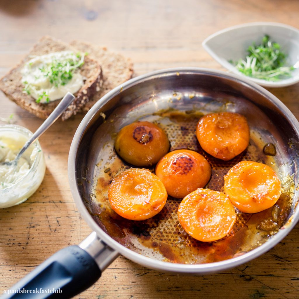 - 1 EL Zucker in eine Pfanne geben und bei mittlerer bis hoher Temperatur leicht karamellisieren. Aprikosen mit der Schnittfläche nach unten hinein geben und 5 bis 8 Minuten goldbraun braten.