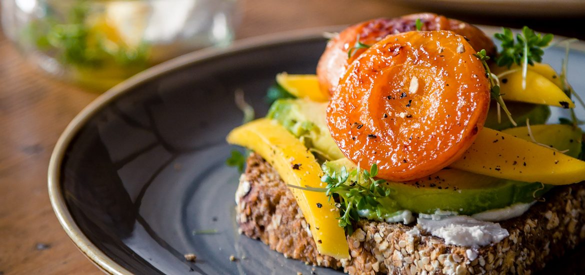 - Honig-Ziegenkäse auf Brotscheiben verteilen, Avocado- und Mangoscheiben sowie gebratene Aprikosen darauf geben und mit Kresse garnieren.